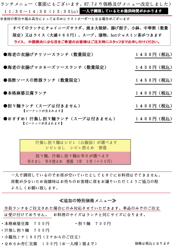 一人で調理しているため時間がかかる場合がございます。お時間に余裕がある時にお越しださい。